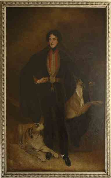 FULL LENGTH PORTRAIT OF A YOUNG OFFICER WITH PET DOGS