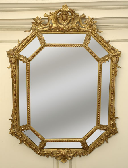 the bevelled octagonal mirror plate in moulded frame with further sloping mirror panels, with acanthus carved angles and pierced cartouche cresting