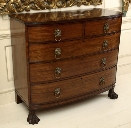 the D-shaped reeded top above two short over three long graduated drawers, with lion’s head ring handles, on hairy paw feet