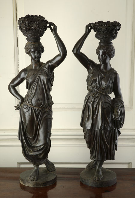 modelled as a robed women holding aloft baskets of grapes, signed 'Coinchon 1856', base edges marked, 'SUSSE FRES EDT', restorations (2)