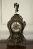 the twin train movement striking on a coiled gong, the brass dial with Roman numerals on white enamelled cartouches, the caddy top mounted with cast winged victory figure, the acanthus cast waisted case with arched glazed door, enclosing pendulum, shaped cast apron, on scrolled legs
