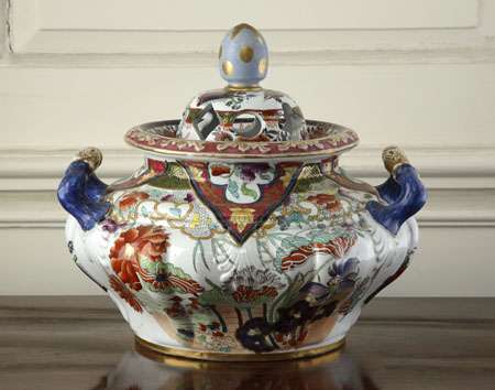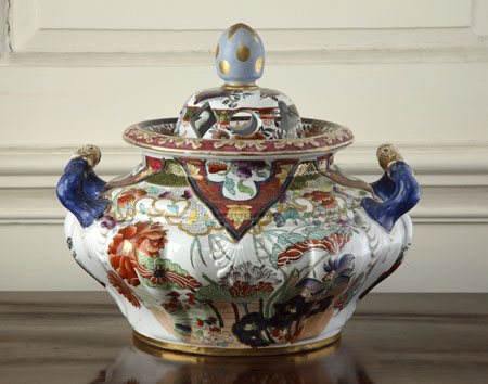 of globular form, twig form handles, boldly decorated with flowers and landscape scenes in the Imari palette (replaced finial)