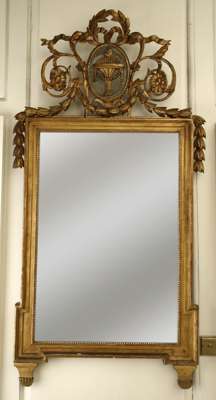 the rectangular mirror plate in moulded rectangular frame, with oval urn surmount surrounded by scrolling acanthus and harebell chains