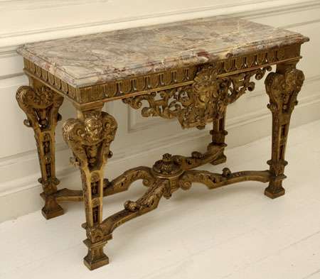 the moulded rectangular red/grey marble top above carved and pierced frieze and apron centred by a female mask, on acanthus and harebell carved and pierced square tapering legs headed by male masks, joined by acanthus carved X-stretcher, on square feet