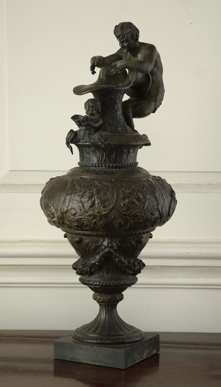 with foliate and leaf scroll decoration throughout, the top with a triton and a sea nymph holding a conch shell above classical scenes and foliate garlands, on a fluted spreading foot with plinth base