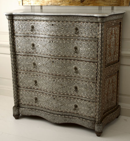 A Syrian marble topped mother-of-pearl inlaid hardwood serpentine chest