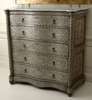 the moulded eared veined grey marble top above cushion frieze and five long drawers with chevroned bone mouldings, between reeded column angles, shaped apron, on turned feet