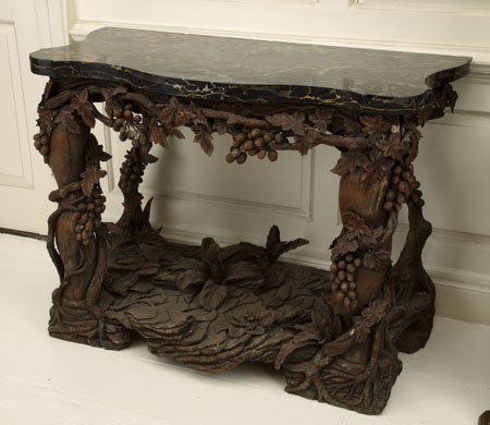 each with serpentine veined black marble top, on elaborately carved base with fruiting vine frieze and spiralling legs above a rockwork base carved with leafy plants, on root carved feet (2)