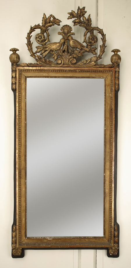 the two rectangular mirror plates in ball and stiff leaf moulded frame with scroll carved surmount centred by two birds