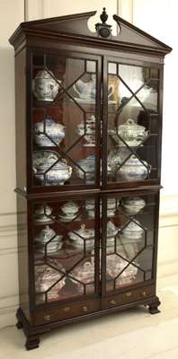 of George III style, the broken pediment with chequer banding centred by an urn above carved oval paterae, over two astragal glazed doors, enclosing later glass shelves, the lower section with two further astragal glazed doors, enclosing shelves, above two short drawers, on ogee bracket feet