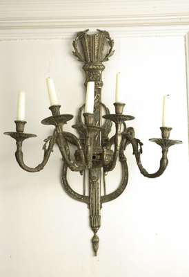 of Empire style, each with five stylised swan S-scroll arms issuing from quiver form backplate, with laurel crestings (2)
