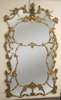 of George III style, with two main cartouche shaped mirror plates surrounded by various shaped smaller plates between rococo scroll carved spacer bars, within scrolling foliate carved frame with cartouche and floral carved surmount flanked by thunder clouds
