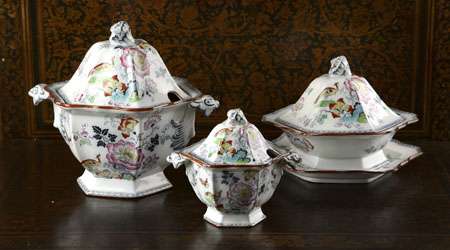each piece with scrolling red rim, printed and painted with exotic birds and bold flowers and foliage, comprising: a hexagonal soup tureen and cover; two smaller tureens, covers and one stand; a sauce tureen and cover; eleven meat plates; six fish plates; five side plates; six soup bowls; and six dessert bowls, black printed mark ‘Ashworth Bros, Hanley’ (with crown and scroll) and impressed marks (43)