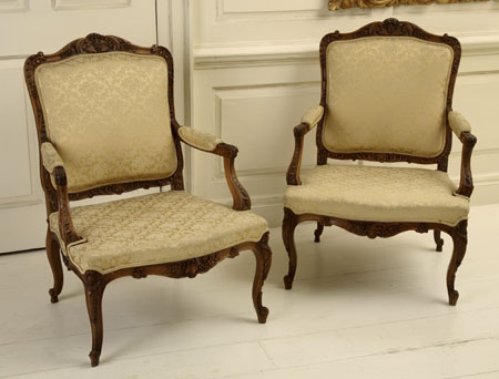 of Louis XV style, each with cartouche shaped back, armrests and serpentine seat covered in gold damask fabric, the frame acanthus and floral carved allover, on cabriole legs with scroll feet (one in Peasenhall Sitting Room) (2)