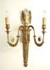 of Louis XVI style, each with foliate decorated S-scroll arms issuing from acanthus leaf decorated torchere form backplate, with trailing husk urn finial (2)