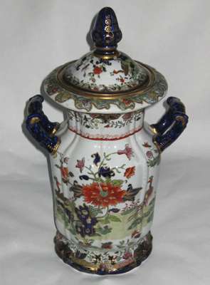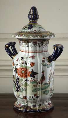of elongated baluster form, with ribbed body, decorated with birds and flowers in the Imari palette, black printed mark