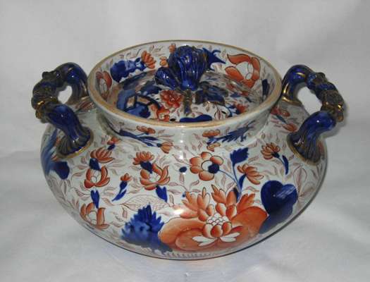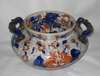 of globular form, with flowerhead finial and twig form handles, boldly decorated with flowers in the Imari palette