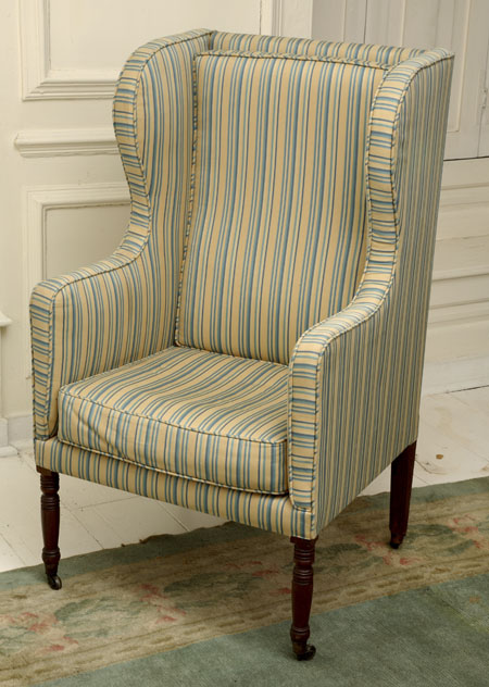 the rectangular cushioned back, wings, arms and cushioned seat covered in yellow and blue striped fabric, on ring and baluster turned legs with brass caps and castors