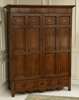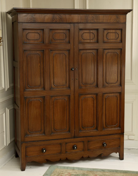 the moulded cornice above veneered frieze, over two cupboard doors with graduated moulded panels, enclosing hanging space, above three short drawers, shaped apron, on stile feet