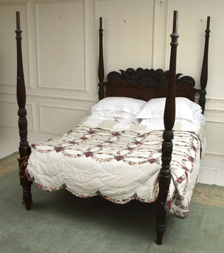 with four reeded baluster and foliate carved columns, foliate scroll carved and panelled headboard, on baluster turned tapering legs