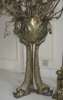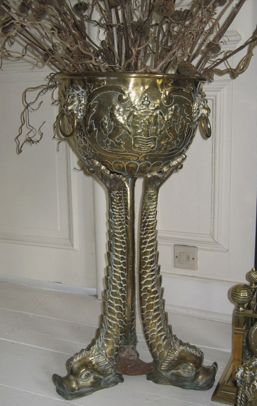 with triple lion mask ring handles, embossed with a coat of arms and two landscape scenes, on associated triple brass marlin supports