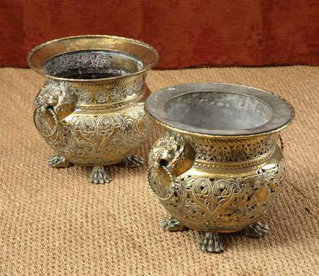 one with tin liner, each with lion mask ring handles and ornately decorated with flowerheads, leafy scroll enclosed shields and lotus leaves, on hairy paw feet (2)