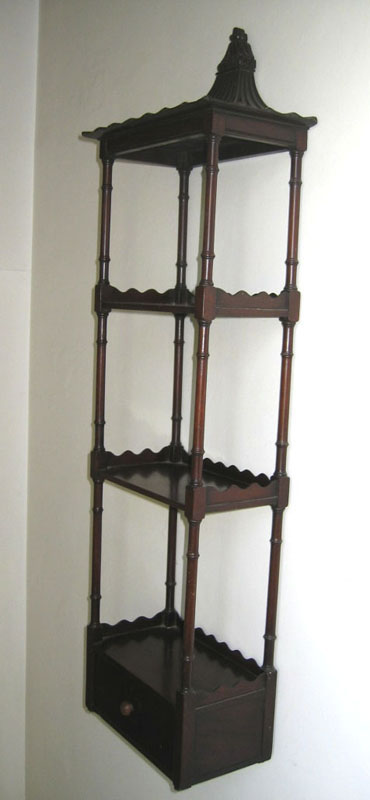 with carved pagoda cornice above three galleried tiers linked by ring turned uprights with single drawer below