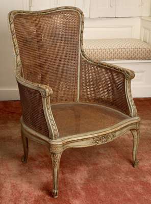 the cane filled curved back, arms and seat, within frame with ribbon carving, on channelled cabriole legs with scrolled feet