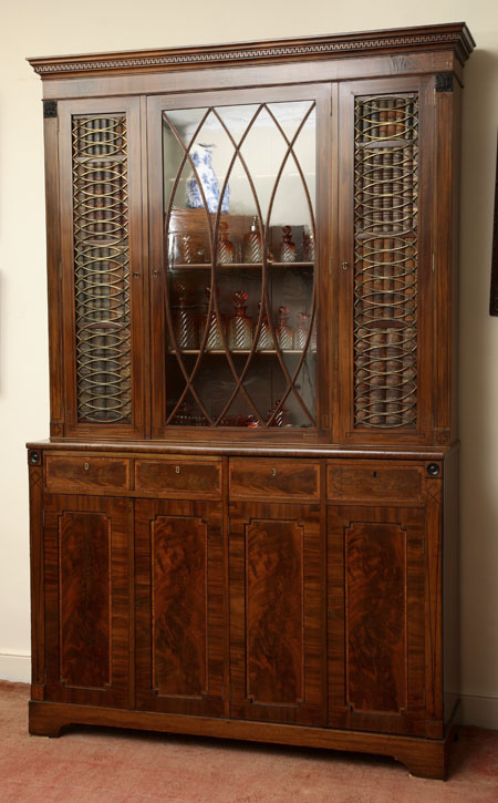 of Regency style, satinwood crossbanded and line inlaid overall, the moulded Greek key cornice above central astragal glazed door, enclosing adjustable shelves, flanked on each side by a brass lattice and faux leather book spine filled door, the projecting base with frieze drawer to one side, above two cupboard doors, two longer cupboard doors to the other, all enclosing shelves and drawers, on bracket feet, mainly early 19th century, adapted