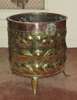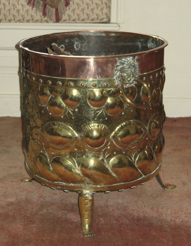of cylindrical form with riveted strapwork, repousse decorated with stylised bands of foliage, on outswept feet