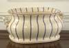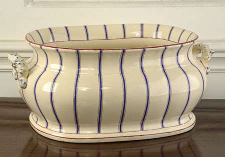 of ovoid form with twin handles, decorated with blue and red stripes on cream ground, red painted ‘N 3692’ (star crack)