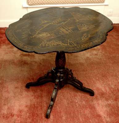 the shaped oval top decorated with raised chinoiserie scenes of figures in a garden with pavilions, within floral and lattice border, on baluster turned column and four pierced downscrolled legs