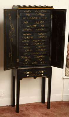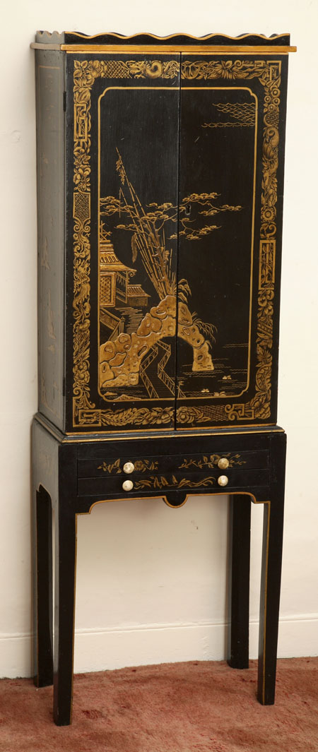 An ebonised and gilt japanned cabinet on stand