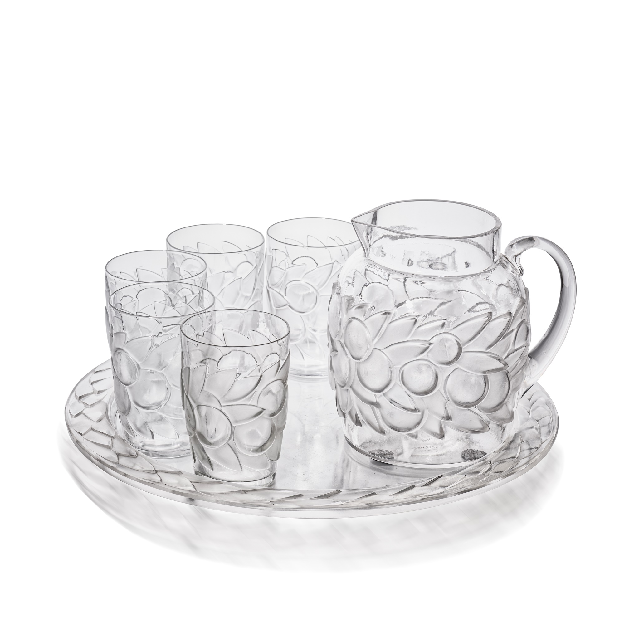 tray and glasses stencilled R. LALIQUE, jug stencilled R. LALIQUE FRANCE
