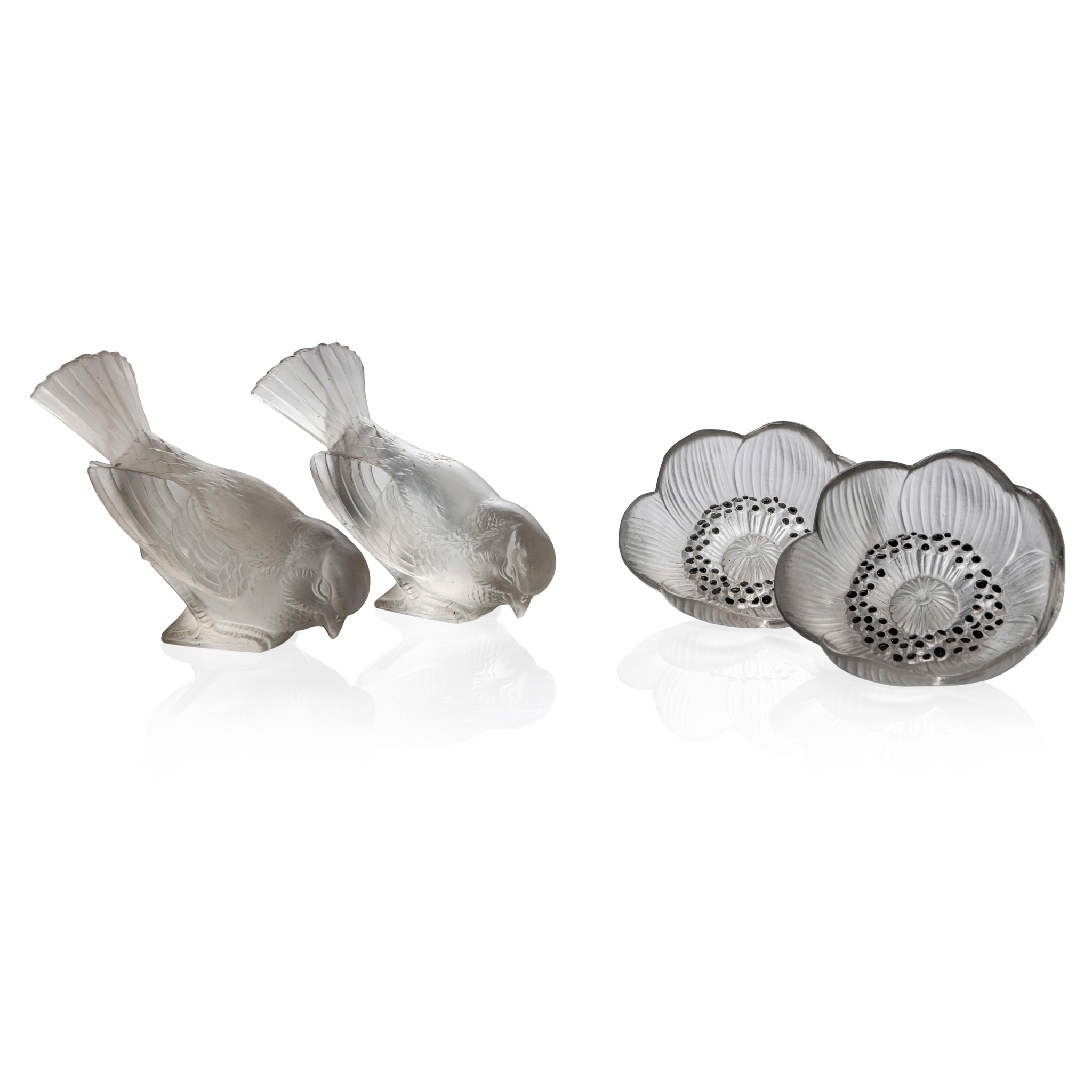 comprising TWO ANÉMONE FERMÉE TABLE DECORATIONS, NO. 1180, designed 1931, clear, frosted, and black enamelled, stencilled R. LALIQUE;