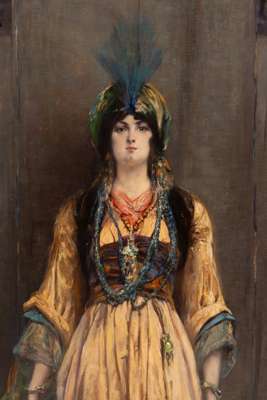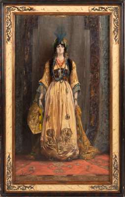 Georges Clairin is best remembered as an orientialist and portrait artist. He was a close friend and advisor to René Lalique. They regularly had dinner together and shared an interest in oriental objects, as well as travelling together to Venice. Clairin belonged to the bohemian world and painted Sarah Bernhardt, the celebrated actress of the day, in her different roles on numerous occasions. He also introduced her to Lalique, and she became one of Lalique’s most significant patrons for whom he designed jewellery. For both men, women were a constant theme of their work. As a family friend it is not surprising that Clairin should have painted Suzanne, René Lalique’s daughter, in costume for her birthday ball.
