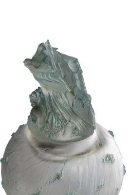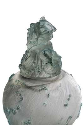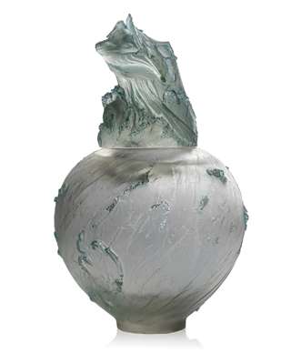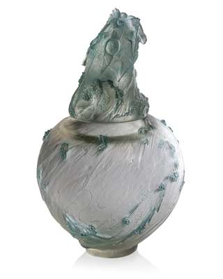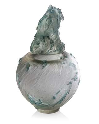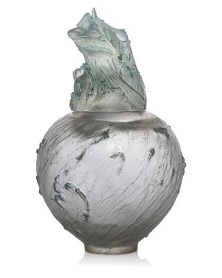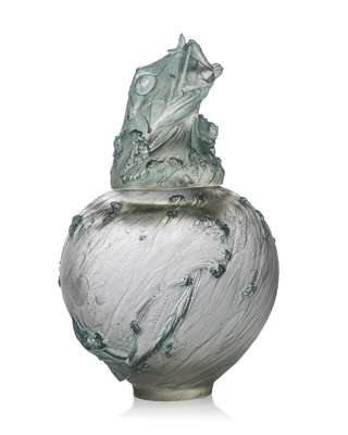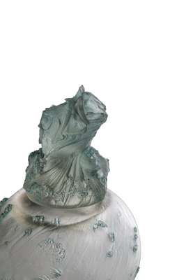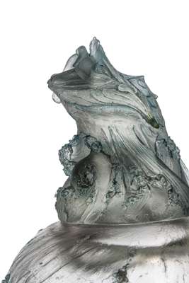 It is noted in Marcilhac's catalogue raisonné (p.1023) that the first cover for the vase produced in February 1921 was damaged during cooling and a further lid was subsequently executed April of the same year. This is a good reminder of the technical challenges of creating works in glass. The cover in many ways can be seen as a work of sculpture in terms of both its scale and the density of the glass itself, and this left the work far more vulnerable to damage during the annealing process. Both the temperature and the speed of cooling are critical and getting it exactly right does not always go according to plan even for master glass makers.