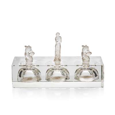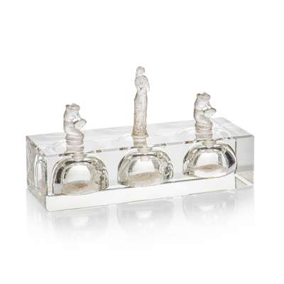 This tester is listed in Felix Marcilhac's catalogue raisonné with a question mark against it as being for D’Orsay. It appears in the catalogue with three identical stoppers rather than with a Roses stopper in the centre, and is listed as being an unmarked piece.