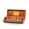 set of twelve clear tester scent bottles with stoppers, each with Coty label, original burr walnut veneered mahogany box, brass ball feet and mounts