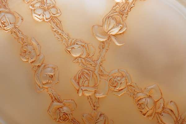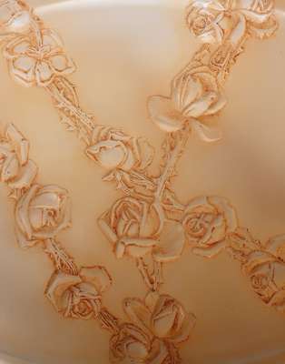 This rare powder box is not only decorated on the cover but also down the sides and on the underside. The cover is intended to be placed on the base in one way only so that the roses extend as a continuous unifying garland around the entire piece.