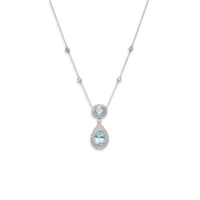 The oval-cut aquamarine, within a pavé-set surround of brilliant-cut diamonds, suspended from a similarly designed surmount, to a trace-link chain, spectacle-set with brilliant-cut diamonds to the front, diamonds approx. 1.10 carats total, aquamarines approx. 7.80 carats total, lengths: pendant 3.9cm, chain 43.5cm