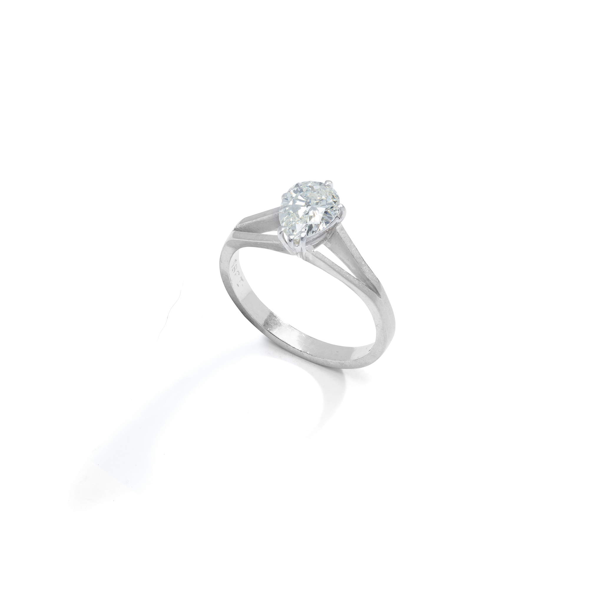 The pear-shaped diamond, in a six-claw setting, between bifurcated shoulders, diamond approx. 1.10 carats, ring size N½