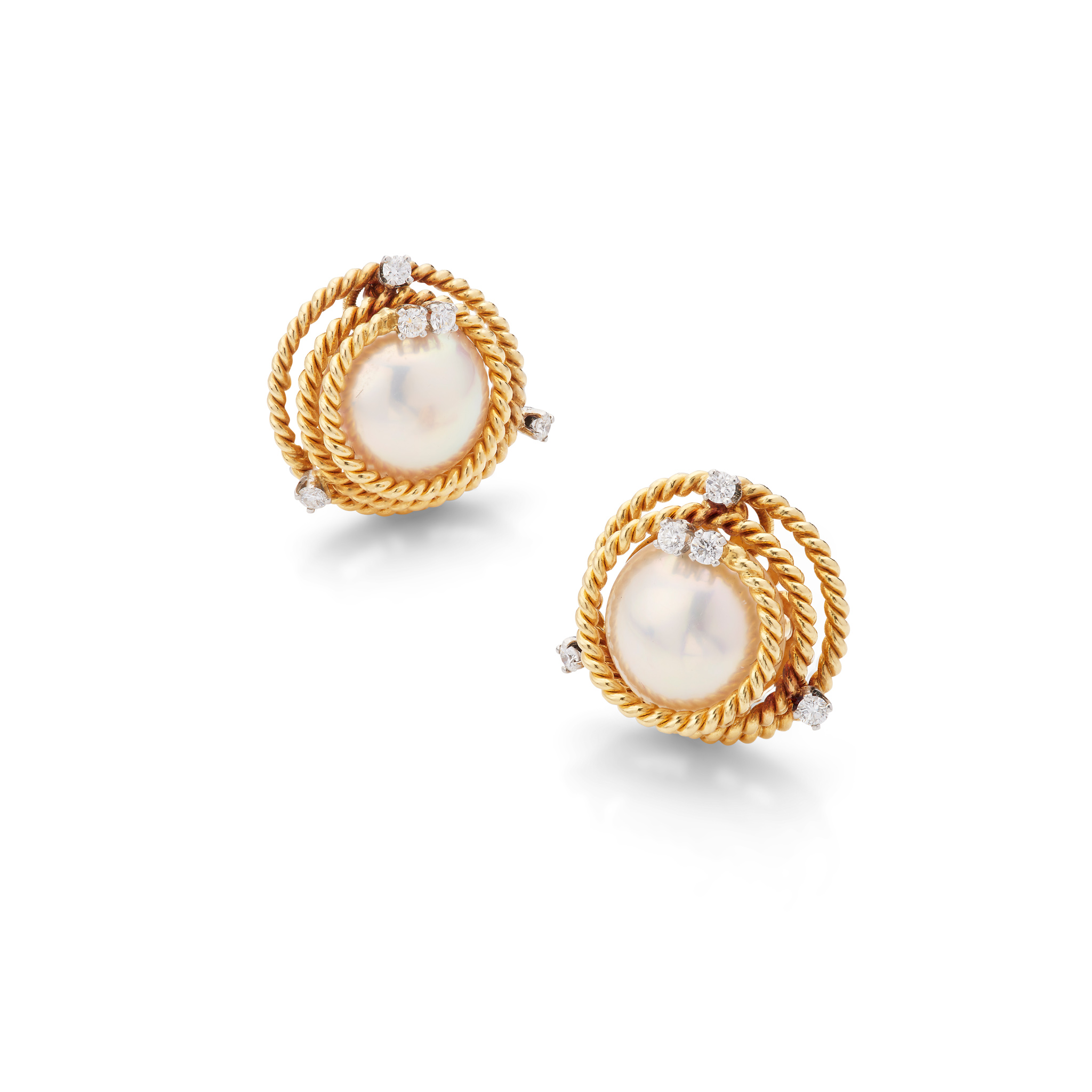 Each mabé-pearl within a rope-twist scroll, accented by brilliant-cut diamonds, diamonds approx. 0.70 carat total, signed Tiffany & Co. Schlumberger Studios, post and clip fittings, length 2.2cm