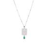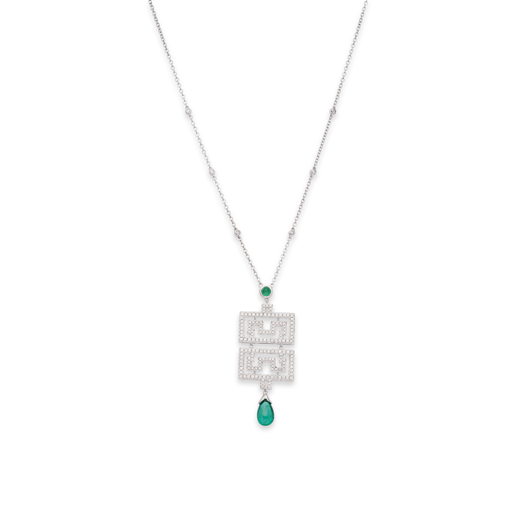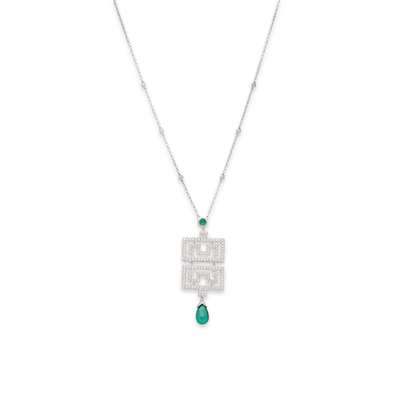 The openwork rectangular plaque with a geometric motif, set throughout with brilliant-cut diamonds, suspending an emerald drop, surmounted by a single circular cabochon emerald, to a trace-link chain bezel-set to the front with brilliant-cut diamonds, diamonds approx. 0.90 carat total, lengths: pendant 4.9cm, chain 42.4cm