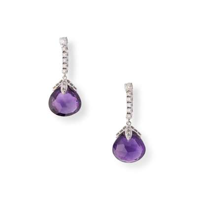 Each amethyst briolette, suspended from a line of brilliant-cut diamonds, the largest at the surmount, mounted in 18 carat white gold, diamonds approx. 0.90 carat total, UK hallmarks, post fittings, length 2.8cm