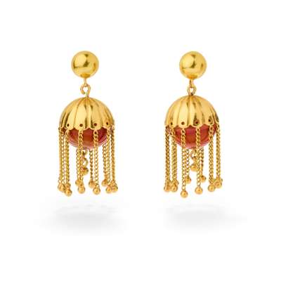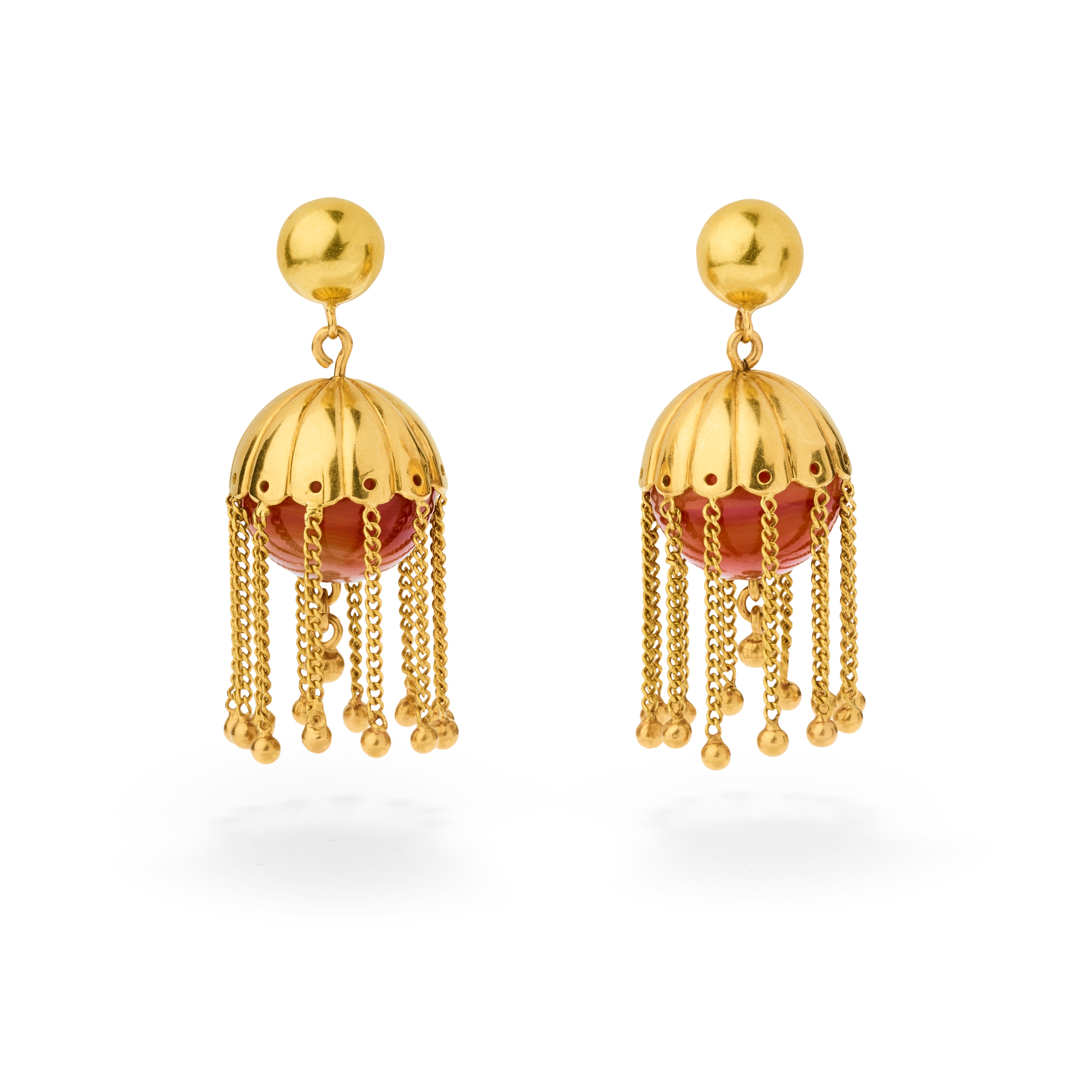 Each agate sphere contained within a segmented cap, suspending a curb-link tassel, post fittings, length 4.3cm