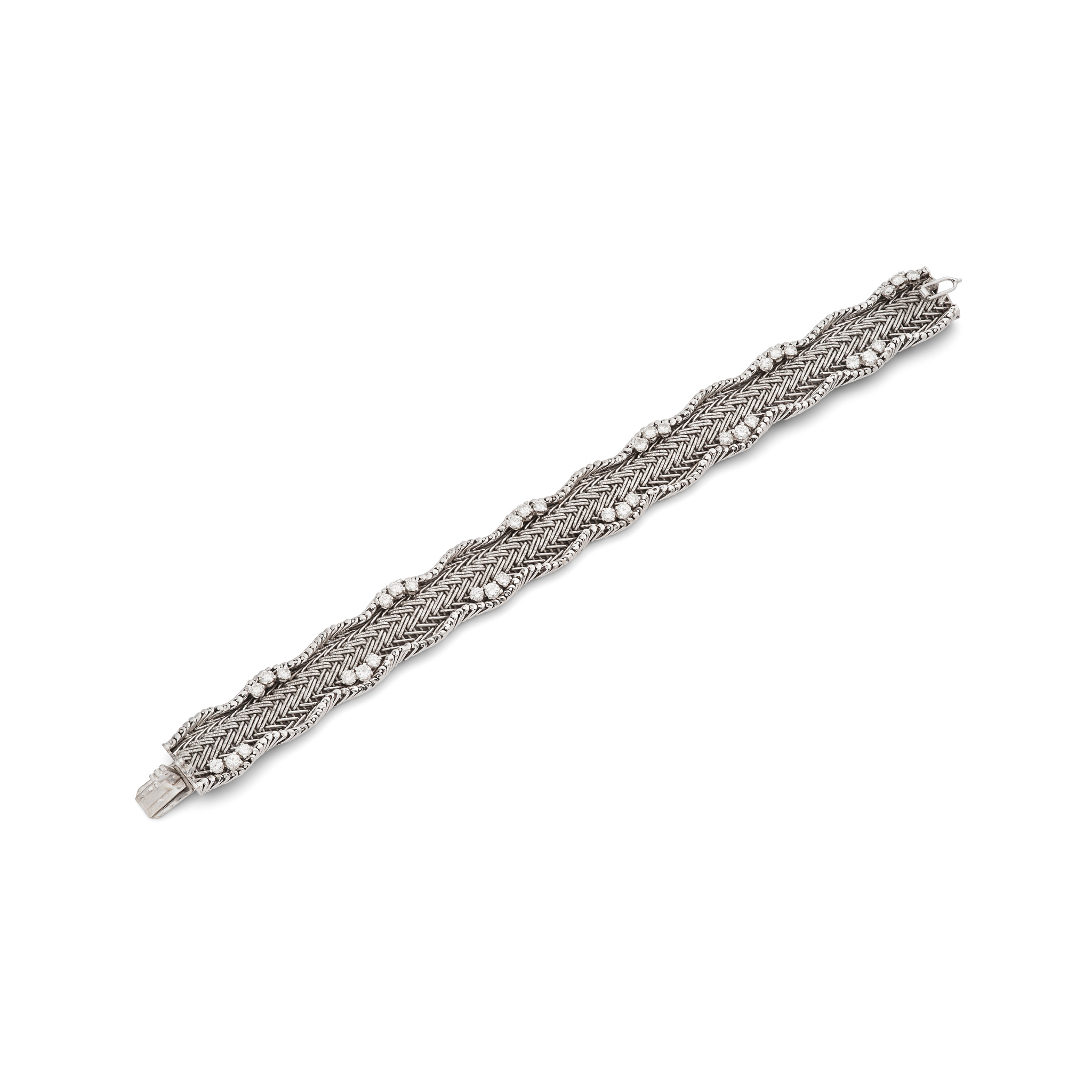 The interwoven bracelet accented throughout with trios of brilliant-cut diamonds, diamonds approx. 3.60 carats total, French export marks, length 18.7cm