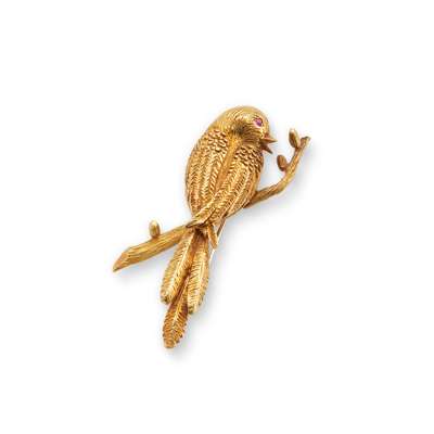 Realistically modelled as a long-tailed tit, set with a circular-cut ruby eye, perched on a textured twig, signed Boucheron, partially struck maker's mark ER for Richards, Paris, numbered, French assay marks, length 5.4cm