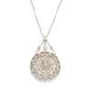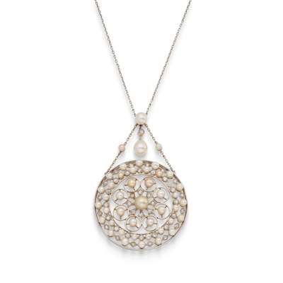 The filed belcher-link chain suspending a 5.4 - 6.0mm pearl knife-wire drop to an openwork and pierced circular pendant set throughout with rose-cut diamonds, seed pearls and 4.1-5.9mm pearls, pearls untested, one seed pearl deficient, lengths: pendant 6.2cm, chain 60.0cm