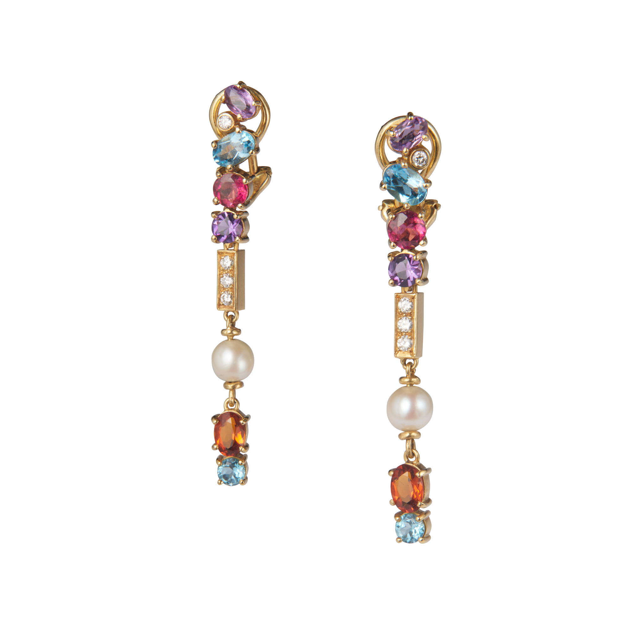 Each articulated line of oval and circular-cut gems, including pink tourmaline, amethyst and blue topaz, accented by a 5.5mm cultured pearl and brilliant-cut diamonds, clip fittings, length 5.2cm